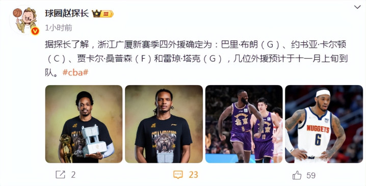 球圈赵探长报道:“浙江广厦新赛季四外援确定为巴里-布朗(G)、约书亚-卡尔顿(C)、贾卡尔-桑普森(F)和雷琼-塔克(G)E策略平台,几位外援预计于11月上旬到队。”
