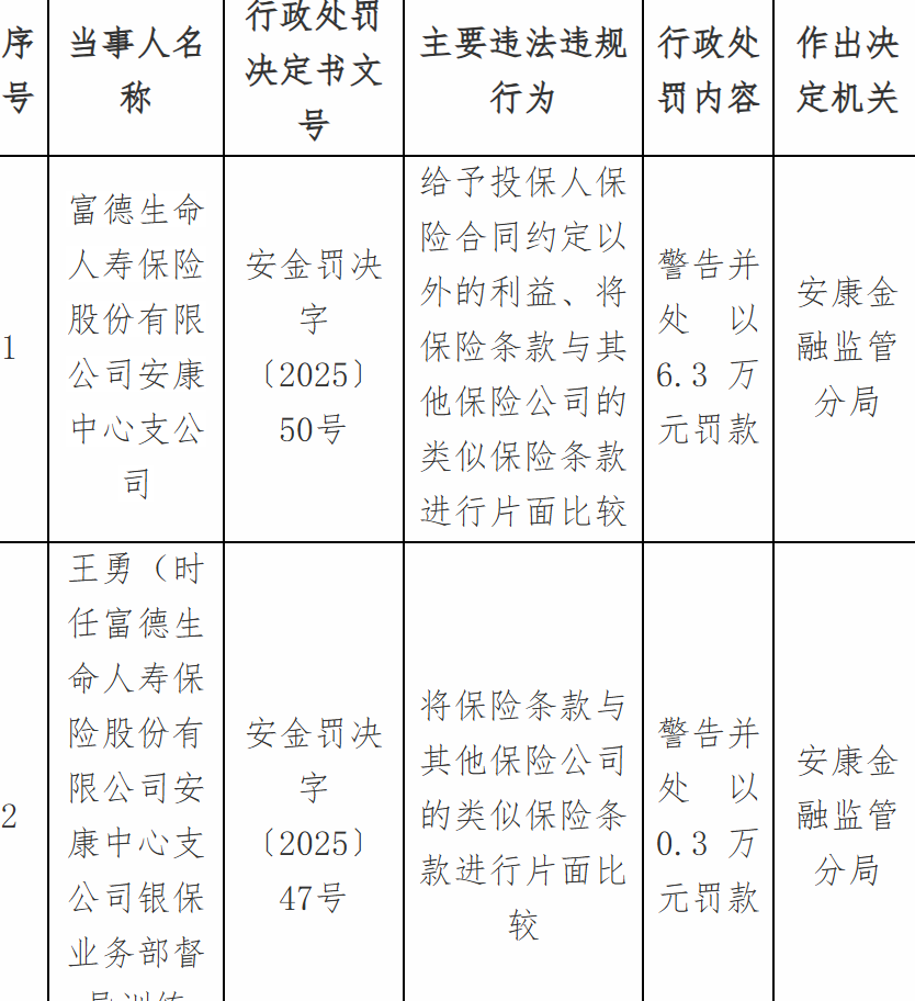 1月5日,国家金融监督管理总局安康监管分局行政处罚信息公示表显示,富德生命人寿保险股份有限公司安康中心支公司因给予投保人保险合同约定以外的利益、将保险条款与其他保险公司的类似保险条款进行片面比较被警告并处以6.3万元罚款;王某、郝某虎被警告并罚款3000元;李某被警告并罚款1.2万元。